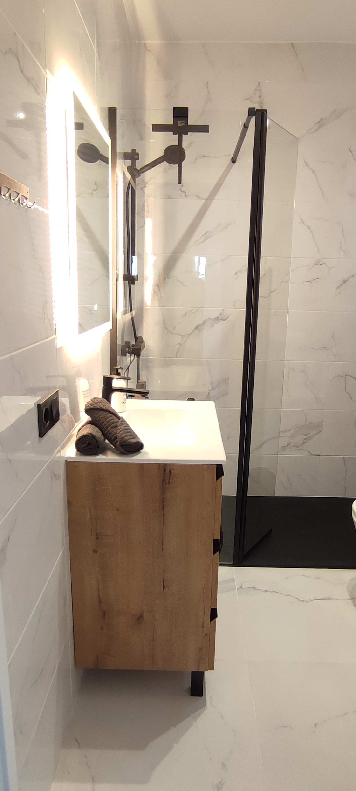 Bright and modern bathroom, equipped with a walk-in shower, bidet shower, washing machine and a hairdryer.